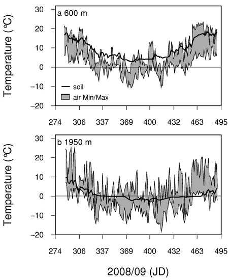 Temperature conditions in the Botanical Garden at 600 m a.s.l. (a) and at the field site at the timberline at 1950 m a.s.l. on Mt. Patscherkofel (b). The solid line shows the daily mean soil temperature at 5 cm depth, the grey area marks the daily minimum and maximum air temperatures measured at a height of 2 m.