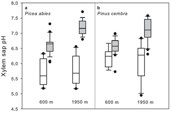 Various mechanisms are reported to be responsible for the regulation of the pHx. All factors that affect proton pump activity [8,11,12] and xylem sap composition, especially the concentration of cations/anions and organic compounds, might be involved [13,14,15]. In addition, the pHx influences the concentration of dissolved CO2 in the xylem sap and therefore regulates the amount of CO2 that can be transported through the xylem in trees [1,9,16]. Seasonal pHx changes in deciduous species may be linked to the onset of the ascent of xylem sap, which is coupled to transpiration in the foliated stage. Unfortunately, studies reporting on seasonal changes of pHx in deciduous trees lack information on phenology and short-term variations during flushing in spring. For evergreen trees and gymnosperms, where the end of winter dormancy and the ascent of xylem sap are not linked to the formation of new leaves, only very few reports about seasonal changes of pHx are currently available. In conifers growing at the alpine timberline a marked pHx alkalinisation during winter is reported [17].