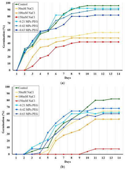 - Uçarlı, C. Effects of salinity on seed germination and early seedling stage. In Abiotic Stress in Plants; IntechOpen: London, UK, 2020; p. 211. [Google Scholar]