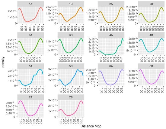 The diversity panel was genotyped using the DArTSeq platform (Diversity Array Technology Pty Ltd. DArT P/L, Canberra, Australia) as described by Ávila et al. []. In summary, a set of more than 190,000 markers was obtained, including both the presence/absence variation and SNP markers. The high-confidence and low-confidence gene models from the ‘Svevo’ genome were used as a template for the alignment of the DArTSeq markers using the BLASTn algorithm (E-value < 1.5 × 10−6, sequence identity > 80%) and BLAST+ []. A final set of 8025 DArTSeq markers corresponding to genes, with a minor allele frequency above 5% and less than 10% of missing data, were used for the association analyses. The distribution of these markers at each chromosome is shown in Figure 1. The linkage disequilibrium decay for the genotypic panel is 2 Mbp [].