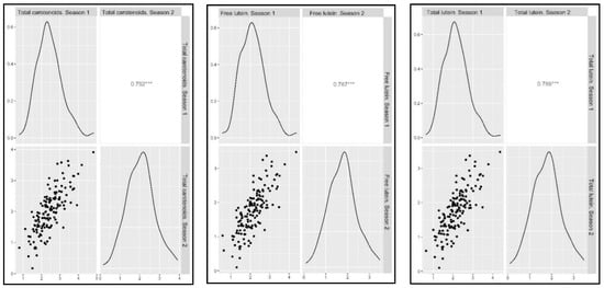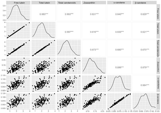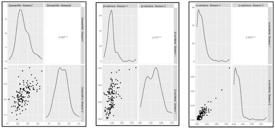The Pearson correlation between the seasons for the total carotenoid content was 0.782 (Figure 2). Similar values were obtained for the total lutein (r = 0.769) and free lutein (r = 0.767). Significant correlations were also found for zeaxanthin (r = 0.597), β-carotene (r = 0.575) and α-carotene (r = 0.920) (Figure 2).