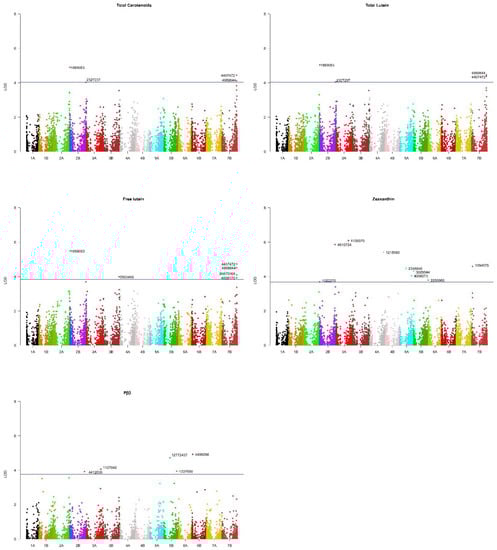 The total carotenoid, total lutein, free lutein, zeaxanthin, α-carotene and β-carotene contents were considered as primary traits for the association analysis. In addition to them, the relative contribution of the β,β-carotenoids to the total carotenoid pool (Pββ) was also considered as a secondary trait. The Manhattan plots obtained for each trait are shown in Figure 4. A total of 28 MTAs were identified (Table 1): 4 for total carotenoids (2 on 2B and 2 on 7B), 4 for total lutein (2 on 2B and 2 on 7B), 6 for free lutein (1 on 2B, 1 on 3B and 4 on 7B), 9 for zeaxanthin (2 on 2B, 1 on 3A, 1 on 4A, 3 on 5A, 1 on 5B and 1 on 7B) and 5 for the relative contribution of the β, β-branch carotenoids to the total carotenoid pool (1 on 2B, 1 on 3A, 2 on 5B and 1 on 6B). No MTA was identified for β-carotene or α-carotene, but these carotenoids account for less than 1% of the total carotenoid content in durum wheat, and thus, the potential of any MTA for these traits in breeding is very limited.