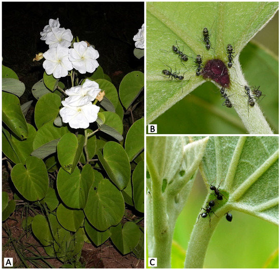 - Keeler, K.H.; Kaul, R.B. Morphology and distribution of petiolar nectaries in Ipomoea (Convolvulaceae). Am. J. Bot. 1979, 66, 946–952. [Google Scholar] [CrossRef]