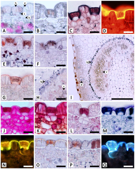 - Kuster, V.C.; da Silva, L.C.; Meira, R.M.S.A.; Azevedo, A.A. Glandular trichomes and laticifers in leaves of Ipomoea pes-caprae and I. imperati (Convolvulaceae) from coastal Restinga formation: Structure and histochemistry. Rev. Bras. Bot. 2016, 39, 1117–1125. [Google Scholar] [CrossRef]