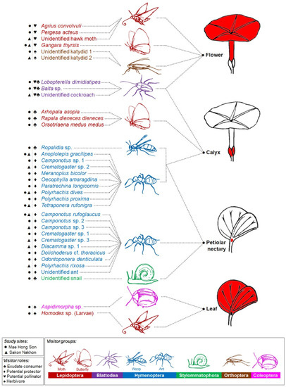 - Jirabanjongjit, A.; Traiperm, P.; Sando, T.; Stewart, A.B. Pollination and floral biology of a rare morning glory species endemic to Thailand, Argyreia siamensis. Plants 2021, 10, 2402. [Google Scholar] [CrossRef] [PubMed]