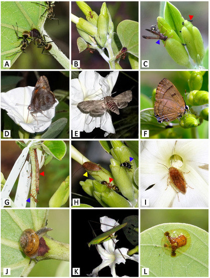- Martins, J.K.S.S.; Carneiro, A.; Souza, L.; Almeida-Cortez, J. How pollinator visits are affected by flower damage and ants presence in Ipomoea carnea subs. fistulosa (Martius and Choise) (Convolvulaceae)? Braz. J. Biol. 2019, 80, 47–56. [Google Scholar] [CrossRef]