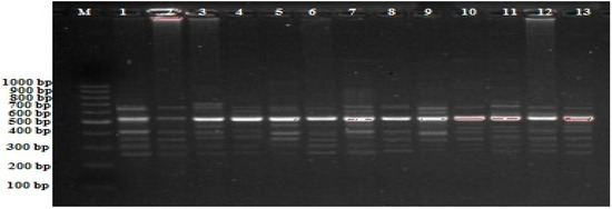 iPBS profiles for various experimental groups with 2075 primers in bean M; 100–1000 bp DNA ladder, 1; control (MS without any hormone) 2; MS medium containing 10−8 mM 17-β-estradiol, 3; MS medium containing 10−6 mM 17-β-estradiol, 4; MS medium containing 10−4 mM 17-β-estradiol, 5; MS medium containing 10−8 mM progesterone, 6; MS medium containing 10−6 mM progesterone, 7; MS medium containing 10 4 mM progesterone, 8; MS medium containing 10−8 mM testosterone, 9; MS medium containing 10−6 mM testosterone, 10; MS medium containing 10−4 mM testosterone, 11; MS medium containing 10−8 mM estrogen, 12; MS medium containing 10−6 mM estrogen, 13; MS medium containing 10−4 mM estrogen.