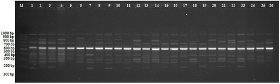 CRED-RA profiles for various experimental groups with OPH-17 primers in bean. M; 100–1000 bp DNA ladder,1; control (MS without any hormone) Msp I 2; control (MS without any hormone) Hpa II, 3; MS medium supplemented with 10−8 mM 17-β-estradiol Msp I, 4; MS medium supplemented with 10−8 mM 17-β-estradiol Hpa II, 5; MS medium supplemented with 10−6 mM 17-β-estradiol Msp I, 6; MS medium supplemented with 10−6 mM 17-β-estradiol Hpa II, 7; MS medium supplemented with 10−4 mM 17-β-estradiol Msp I, 8; MS medium supplemented with 10−4 mM 17-β-estradiol Hpa II, 9; MS medium supplemented with 10−8 mM progesterone Msp I, 10; MS medium supplemented with 10−8 mM progesterone Hpa II, 11; MS medium supplemented with 10−6 mM progesterone Msp I, 12; MS medium supplemented with 10−6 mM progesterone Hpa II, 13; MS medium supplemented with 10−4 mM progesterone Msp I, 14; MS medium supplemented with 10−4 mM progesterone Hpa II, 15; MS medium supplemented with 10−8 mM testosterone Msp I, 16; MS medium supplemented with 10−8 mM testosterone Hpa II, 17; MS medium supplemented with 10−6 mM testosterone Msp I, 18; MS medium supplemented with 10−6 mM testosterone Hpa II, 19; MS medium supplemented with 10−4 mM testosterone Msp I, 20; MS medium supplemented with 10−4 mM testosterone Hpa II, 21; MS medium supplemented with 10−8 mM estrogen Msp I, 22; MS medium supplemented with 10−8 mM estrogen Hpa II, 23; MS medium supplemented with 10−6 mM estrogen Msp I, 24; MS medium supplemented with 10−6 mM estrogen Msp I, 25; MS medium supplemented with 10−4 mM estrogen Hpa II, 26; MS medium supplemented with 10−4 mM estrogen Msp I.