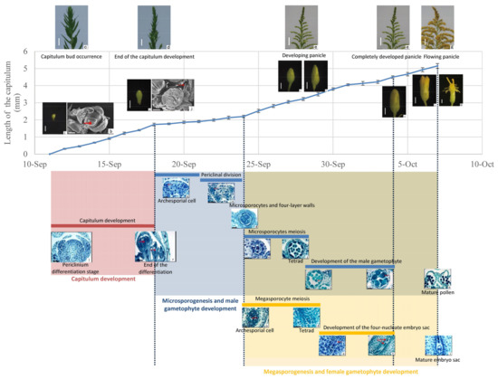 According to our observation, the capitulum development of S. canadensis began with a time gap of about one week, while the duration of capitulum development in the subsequent stages was the same. The developmental periods of capitulum development, microspore, and megasporocyte meiosis were seven days, four days, and five days, respectively. Figure 5 records the duration of capitulum development, the occurrence of megasporogenesis and microsporogenesis, and their correspondence with capitulum morphology or the length of capitulum. In general, within the flower of S. canadensis, the stamen appeared and developed earlier than the pistil, but they matured around the same time before flowering.