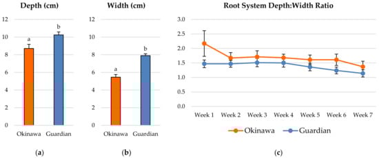 Average (a) depth and (b) width reached by the whole-root system of the ‘Okinawa’ and ‘Guardian’™. (c) Depth:width ratio of the whole-root system of the ‘Okinawa’ and ‘Guardian’™. Bars with different letters indicate significantly different values according to Tukey’s (HSD) test (p ≤ 0.05).