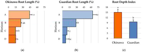 Root horizon A of the ‘Okinawa’ represented a significantly larger portion of the total root length (44.2%) compared to horizons C (14.8%) and D (15.1%), but was not significantly different from horizon B (25.9%). Furthermore, there were no significant differences in root length between horizons B, C, and D (Figure 3a). Similarly, root horizon A of the ‘Guardian’™ presented a root-length percentage (63.36%) that was significantly higher than that of horizons B (28.4%), C (9.8%), and D (7.12%). Moreover, horizon B was significantly higher than horizons C and D in this cultivar for this parameter, whereas horizons C and D were not significantly different (Figure 3b). Finally, the root-depth index (RDI) of the ‘Okinawa’ (15.09) was significantly higher than that of the ‘Guardian’™ (9.58) (Figure 3c).