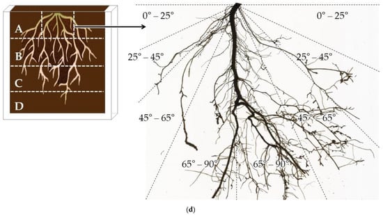 To study the root spreading angles of each genotype, a slightly modified version of the protocol followed by Ramalingam et al. [56] was applied. The scanned images from the central portion of horizon A were split into four angular sections projected from the base of the seedling: shallower (0–25°), shallow (25–45°), deep (45–65°), and deeper (65–90°) (Figure 4d). Subsequently, the root length (cm) was measured from each angular section.
