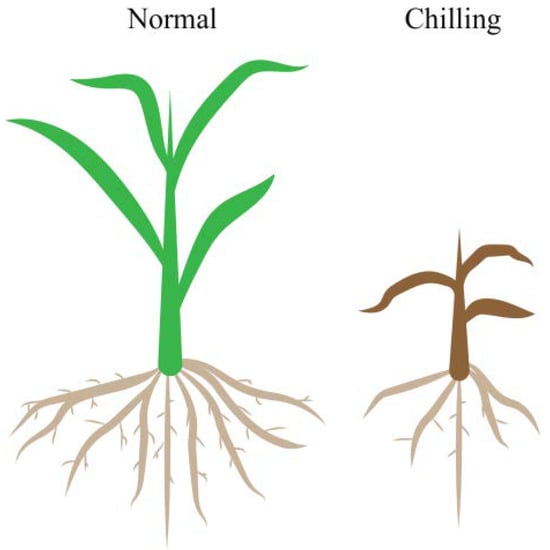 Maize is a thermophilic crop originating from Mexico with an optimum growth temperature of 25–28 °C and a minimum growth temperature of 6–10 °C. It is susceptible to temperature stress below 12 °C [2]. Low-temperature stress has multiple adverse effects on the maize morphology and physiology. Morphologically, low-temperature stress reduces seed emergence and seedling establishment, leading to leaf wilting and chlorosis; severe cold damage can result in rotted seeds, necrosed leaves and even plant death [3,4]. A low temperature affects the root system architecture, reducing root biomass, surface area and volume. It restricts the acquisition of water and nutrients, ultimately hampering the shoot growth under chilling stress [5,6] (Figure 1). In terms of physiology, cold stress causes various changes in membrane fluidity, the antioxidative defense system and photosynthetic performance, among others [7,8,9]. Although cultivation of maize has expanded into higher latitudes, low-temperature stress injury is still one of the most severe agro-meteorological hazards faced in temperate, tropical and subtropical maize-growing regions during sowing. Fluctuating weather, especially low temperatures, always causes risks of yield loss [2,3,10]. Therefore, it is crucial to fully elucidate maize cold-tolerance mechanisms to improve its robustness against cold injuries. This can aid maize in maintaining its growth under low-temperature stress conditions and minimizepotential yield losses. In the last few decades, considerable efforts have been undertaken to understand the mechanism underlying the physio-biochemical responses to low-temperature stress and determine QTLs/genes controlling chilling tolerance.
