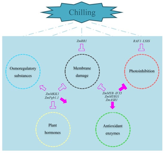 Under chilling stress, overexpression of ZmMKK1 or ZmPgb1.1 enhances the activity of antioxidant enzymes such as sodium dismutase and catalase to alleviate ROS-induced damage. In addition, ZmMKK1 suppresses the increase of malondialdehyde content and relative electrolyte leakage to protect biological membrane stability while increasing osmoregulatory substances such as proline and soluble sugar. Overexpression of ZmPgb1.1 inhibits BR biosynthesis. Meanwhile, overexpression of ZmMYB–IF35, ZmASR1 or ZmMYB31 reduces photoinhibition by a slow decrease in Fv/Fm and an increase in sodium dismutase activity. Alternatively, overexpression of ZmMYB–IF35 or ZmRR1 results in low ion leakage levels, whichmitigate membrane damage caused by low temperature. In transgenic lines overexpressing RAF1–LSSS, photosynthesis parameters such as ΦpsII, ΦII and Fv/Fm slightly decrease to maintain a low degree of photoinhibition. In Figure 3, arrows indicate increases and T-shapes indicate decreases. Solid arrows and T-shapes represent the involvement of multiple genes, and hollow arrows and T-shapes represent the involvement of individual genes.