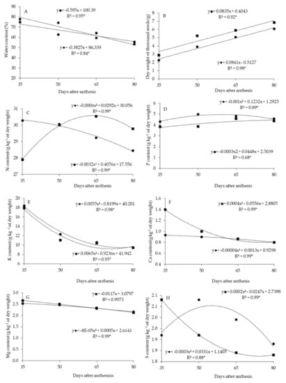 Regarding K, Ca and Mg content, the behavior was different from the dry matter accumulation in seeds. The content of these macronutrients had a reduction during most periods of the maturation stage (Figure 1E–G). According to [38], as the plant grows, nutrients are diluted, reducing the concentration in the tissues. The same probably happens in seeds as the maturation stages advance.