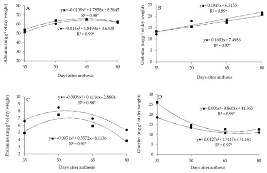 For proteins, the content of albumin and prolamine had quadratic responses, with maximum estimated values without fruit rest of 64.7 and 7.9 mg g−1 of DM, at 66 and 53 DAA, respectively. Post-harvest resting, the maximum albumin content was estimated at 65.9 mg g−1 of DM at 64 DAA, and prolamine was estimated at 7.1 mg g−1 of DM at 55 DAA (Figure 2A,C).