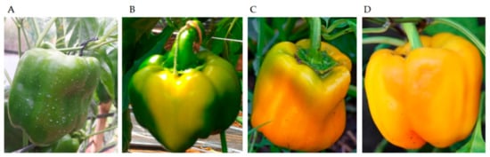 - Cisternas-Jamet, J.; Salvatierra-Martínez, R.; Vega-Gálvez, A.; Stoll, A.; Uribe, E.; Goñi, M.G. Biochemical composition as a function of fruit maturity stage of bell pepper (Capsicum annum) inoculated with Bacillus amyloliquefaciens. Sci. Hortic. 2020, 263, 109107. [Google Scholar] [CrossRef]