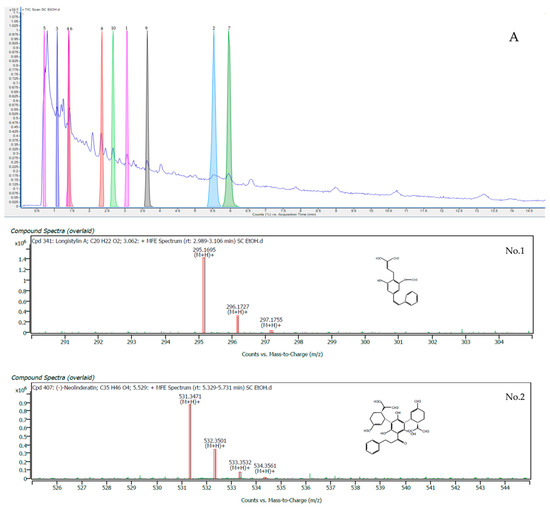* LC-QTOF/MS analysis of the top ten compounds in terms of matching scores of S. cobularia ethanolic crude extract: (A) LC-OTOF-MS chromatogram; (No. 1) mass spectrum of longistylin A; (No. 2) (–)–neolinderatin; (No. 3) 2′,4′–dihydroxy–7–methoxy-8-prenylflavan; (No. 4) ent–8–deoxy-J2–IsoP; (No. 5) butoctamide hydrogen succinate; (No. 6) 9Z,12E,15E-octadecatrienoic acid; (No. 7) neolinderatone; (No. 8) geissospermine; (No. 9) (3aS)–1–methyl3a–(3–methylbut–2–en–1–yl)–1,2,3a,8,8ahexahydropyrrolo [2,3–b] indole; and (No. 10) stigmatellin Y.