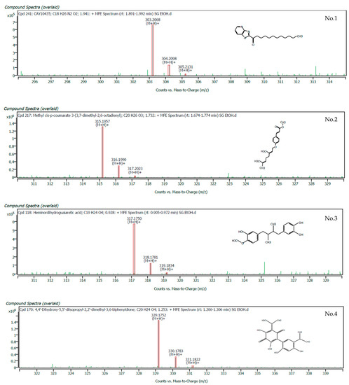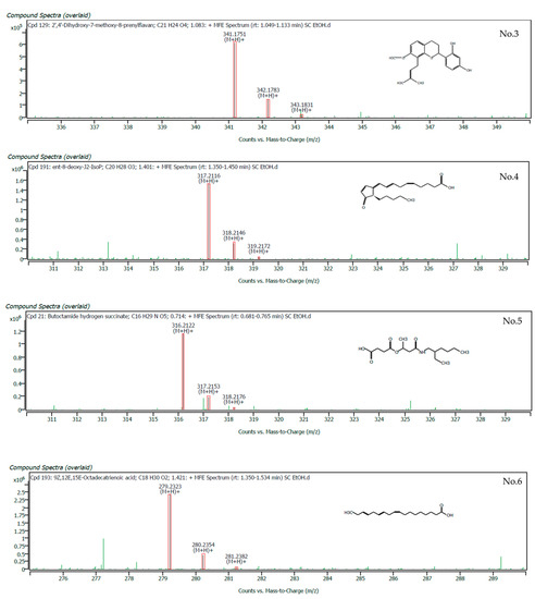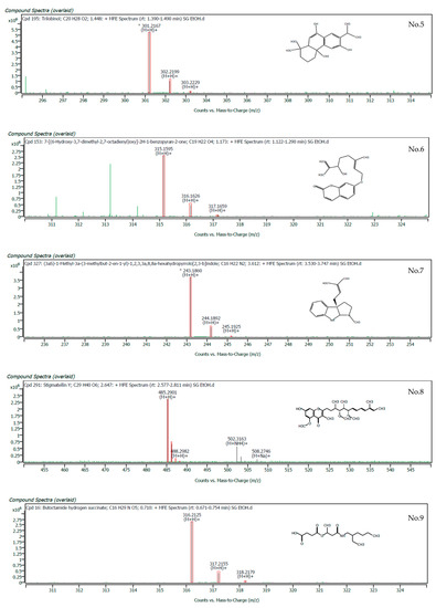The experimentally measured mass of each ion was evaluated against the exact mass of the molecular formula and the expected isotope pattern for that formula. These data were used to score the matching of the ions with the database by the MassHunter Qualitative Analysis Software find-by-formula search of the Agilent MassHunter METLIN Metabolomics Database. The top ten compounds in terms of matching scores of the ethanolic crude extract of S. cobularia, which have a higher matching scores (96.96–99.66%), are shown in Table 1, and the mass spectra showing specific peaks and their corresponding compounds are shown in Figure 1.
