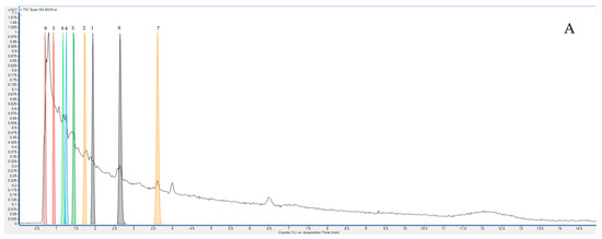 The qualitative dataset of the extracted sample was qualified by using LC-MS in tandem with a quadrupole time-of-flight mass spectrometer (QTOF-MS), according to the adopted method of Chiwat et al. (2021) [24]. In brief, the extracted samples were dissolved in 0.01% formic acid and ethanol (1:1, v/v) at a concentration of 1 mg/mL and cleaned up using a dispersive SPE kit with fat and pigments (Agilent Technology, Santa Clara, CA, USA). The sample solution was filled through a 0.22 μm filter. The qualitative dataset was determined using an Agilent 1290 Infinity II series coupled to a 6546 LC/Q-TOF instrument (Agilent Tech., Santa Clara, CA, USA), which consisted of a degasser, binary pump, column oven, and thermostat autosampler. The instrument settings were optimized as follows: LC conditions, UV at 330 nm; 0.2 mL/min flow rate; injection volume of 10 μL; and a mobile gradient system starting with 5% ACN and 95% water (1% formic acid), decreasing to 20% ACN in 5 min, 30% ACN in 5 min, 35% ACN in 5 min, 45% ACN in 5 min, 75% ACN in 5 min, and 95% ACN until the run ended. The chromatographic separation was accomplished using a ZORBAX Eclipse Plus C18 column (2.1 × 150 mm, 1.8 µm). The MS conditions involved an electrospray ionization (ESI) probe in the positive mode. The nebulizer was operated at 20 psi with a 7 L/min N2 flow. The capillary temperature was kept at 300 °C; the flow rate was set at 8 μL/min. The m/z range was 50–1000, the capillary voltage was 4500 V, and the dry heater temperature was 280 °C. The experimentally measured mass of each ion was evaluated against the exact mass of the molecular formula and the expected isotope pattern for that formula. These data were used to score the match of the ions with the database by the MassHunter Qualitative Analysis Software (Agilent MassHunter Workstation Qualitative Analysis version 10.0, California, USA) find-by-formula search of the Agilent MassHunter METLIN Metabolomics Database. The chemical parameters for compounds were determined using the Medlin library.