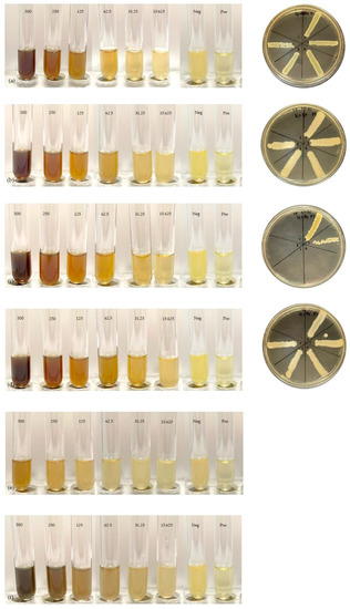 MIC and MBC with Smilax glabra: (a) ethanol extract and bacteria M2. (b) Ethanol extract and bacteria M1. (c) Methanol extract and bacteria M2. (d) Methanol extract and bacteria M1. (e) Water extract and bacteria M2. (f) Water extract and bacteria M1.
