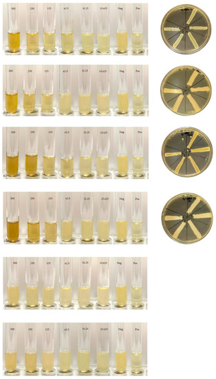 MIC and MBC with Smilax corbularia: (a) ethanol extract and bacteria M2. (b) Ethanol extract and bacteria M1. (c) Methanol extract and bacteria M2. (d) Methanol extract and bacteria M1. (e) Water extract and bacteria M2. (f) Water extract and bacteria M1.
