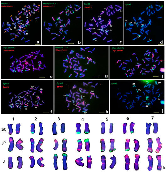 The wheat–barley bulked oligo pools Synt1 to Synt7 were then used by sequential FISH for validation of the signal distribution and specificity for the chromosomes of Th. intermedium PI440043 (Figure 1). Each chromosome plate was first analyzed by ND-FISH with probe combinations of Oligo-B11 + Oligo-pDb12H (Figure 1a) and then Oligo-pSc119.2 + Oligo-pTa535 (Figure 1b,e,g,i). For example, the probe Synt5 produced strong hybrid green signals on each of three homoeologous chromosome pairs along the entire lengths of these groups of six chromosomes (Figure 1c). According to ND-FISH results, the three pairs of homoeologous chromosomes belong to each St, J and JS subgenome. They are thus designated as 5St, 5J and 5JS (Figure 1c). In the same metaphase cell, the probe Synt7 generated distinct red signals on three chromosomes pairs of 7St, 7J and 7JS (Figure 1c), and Synt3 identified another three chromosomes pairs 3St, 3J and 3JS (Figure 1d), respectively. Similarly, the bulked probes Synt1, Synt2, Synt4 and Synt6 also hybridized to mitotic chromosomes of Th. intermedium, and they all produced distinct signals on their individual three homoeologous chromosomes pairs (Figure 1). Therefore, all seven painting probes resulted in distinct hybridization signals covering chromosome arms along their entire lengths for each linkage group, suggesting that the bulked Oligo-based FISH painting can be used to identify each of the Th. intermedium chromosomes or chromosome segments of particular homoeologous groups. The 21 chromosome pairs were finally assigned to seven homoeologous groups among St, J and JS- subgenomes (Figure 1k).