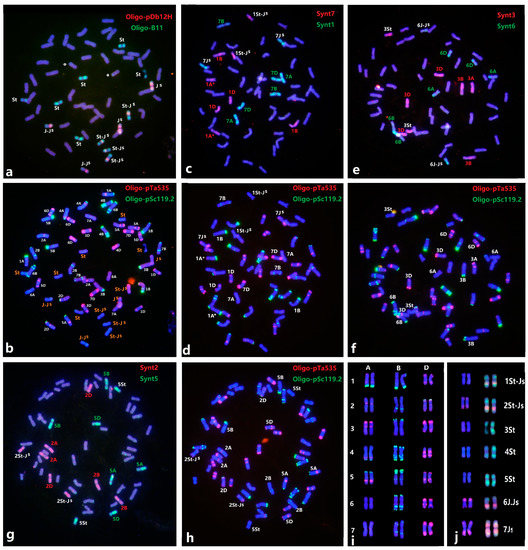 The wheat–Th. intermedium partial amphiploid TAF46 was selected to characterize the Thinopyrum chromosome compositions. Sequential ND-FISH using Oligo-pSc119.2 and Oligo-pTa535 could easily distinguish the 42 wheat chromosomes and a total of 14 Th. intermedium chromosomes. The hybridization signals of probes Oligo-B11 and Oligo-pDb12H appeared to clearly distinguish the St, J and JS chromosomes in TAF46 (Figure 2a). The 42 wheat chromosomes consisted each of 12 A, 14 B, and 16 D chromosomes, including two pairs of 5BS.7BS and 5BL.7BL reciprocal translocation chromosomes, as well as the absence of chromosome 6A substituted by four chromosome 6D in TAF46 (Figure 2a,b). FISH using the probes Oligo-B11 and Oligo-pDb12H for TAF46 showed the absence of Oligo-pDb12H hybridization signals, indicating that TAF46 did not possess JS chromosomes. A total six St and eight J chromosomes were observed based on the hybridization patterns of Oligo-B11 (Figure 2a,b). This is consistent with the previous reports of St-genome based GISH [3]. The Oligo-FISH painting by seven probes gave rise to distinct hybridization signals covering wheat and Th. intermedium chromosome arms along their entire lengths for each homoeologous group. The probe Synt1 produced strong green signals on the chromosome pairs of 1A, 1B and 1D (Figure 2c), in addition to another a pair of Th. intermedium group 1 chromosomes, which was defined as chromosomes 1J compared to the standard karyotype (Figure 2b,d). Similarly, the probe Synt3 generated distinct red signals on eight chromosomes including the previously identified 3A, 3B and 3D by Oligo-pSc119.2 + Oligo-pTa535 (Figure 2c), and a pair of Th. intermedium 3J-chromosomes (Figure 2c). Similarly, the bulked probes Synt2 + Synt5 (Figure 3e) and Synt4 + Synt6 (Figure 2g) also hybridized specifically to chromosomes of TAF46, compared to the sequential ND-FISH of Oligo-pSc119.2 + Oligo-pTA535 (Figure 2f,h). These results show that Th. intermedium chromosomes of TAF46 consisted of J genome chromosomes of the homoeologous groups 1, 3, 5, 7 and St genome chromosomes of groups 2, 4 and 6 (Figure 2). The karyotype for individual chromosomes of the subgenomes and linkage groups of Th. intermedium of TAF46 is shown in Figure 2j. Our results are consistent with the chromosome assignment of Th. intermedium addition lines by GISH and molecular analysis of the TAF46-derived wheat–Thinopyrum addition lines L1 to L7 [21].