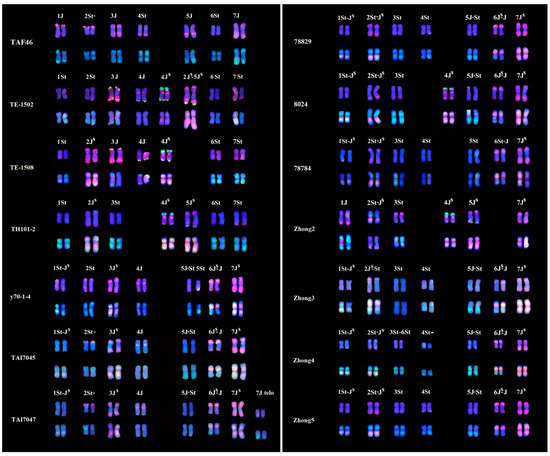 As a perennial grass with a native distribution throughout the Mediterranean and Eastern Europe [1], Thinopyrum intermedium (Host) Barkworth & D.R. Dewey has undergone the most direct selection for hay and pasture grass improvement [2]. As an allohexaploid (2n = 6x = 42), Th. intermedium chromosomes have been previously identified and allocated into three tentatively designated sub-genomes sets as J, JS and St, where St is closely related to the genome of Pseudoroegneria strigosa and J is closely related to that of Th. bessarabicum. The JS genome is a modified version of the J and St genomes [3,4]. Th. intermedium consists of two subspecies, namely, intermediate wheatgrass, ssp. intermedium and a pubescent variant ssp. trichophorum that carries novel and high levels of resistance to several wheat fungal diseases, such as rusts and powdery mildew, and many useful agronomic traits, including novel glutenins, and contributes to the tertiary gene pool for wheat improvement [4,5]. The production and identification of amphiploids or partial amphiploids between wheat and Th. intermedium is an important intermediate step for gene transfer [5]. To date, a number of wheat–Th. intermedium amphiploids, Otrastsyuskaya (OT), TAF46, Zhong1 to Zhong5, 78829, TAI7044, TE-3, TE253-1, TE257, TE267, TE346, SX12-787, SX12-1150 and SX12-1269, have been obtained [4,6,7,8,9,10]. The precise identification of individual Th. intermedium chromosomes is essential for comparative molecular and cytogenetic analysis of Th. intermedium species and the introgression of diverse Th. intermedium chromatin for breeding purposes of wheat.