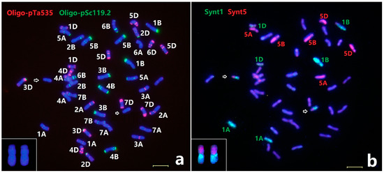 - Tang, S.; Tang, Z.; Qiu, L.; Yang, Z.; Li, G.; Lang, T.; Zhu, W.; Zhang, J.; Fu, S. Developing new oligo probes to distinguish specific chromosomal segments and the A, B, D genomes of wheat (Triticum aestivum L.) using ND-FISH. Front. Plant Sci. 2018, 9, 1104. [Google Scholar] [CrossRef]