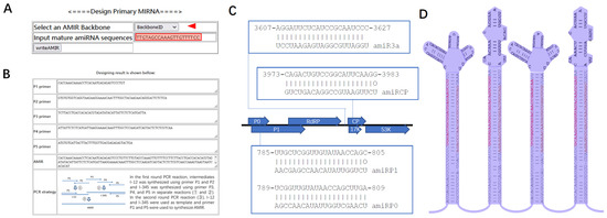 To simplify the design process for the primary artificial miRNA sequences, a webserver, AMIRdesigner, was set up. On the homepage of the webserver, users can select an miRNA backbone from a pulldown menu and paste the mature artificial miRNA of interest (Figure 1A). After clicking the “writeAMIR” button, the five oligo sequences and the designed primary miRNA coding sequences will be printed and a fusion PCR pipeline to generate the designed primary miRNA coding sequences will be shown (Figure 1B).