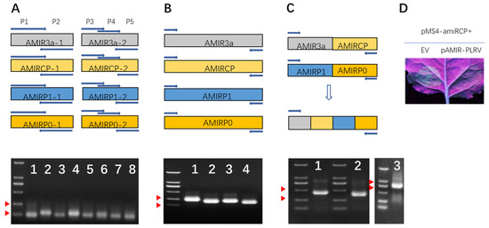 AMIR synthesis was completed in a two-round PCR reaction. In the first-round PCR, part 1 and part 2 of the fragments of each AMIR were synthesized using partially overlapping P1-P2 and P3-P4-P5 primers, respectively (Figure 2A). In the second-round PCR, part 1 and part 2 were used as templates, and P1-P5 primers were used to amplify the fusion product (Figure 2B). As 18 overlapping nucleotide sequences were designed in the P1 and P5 primers of the adjacent AMIRs (Figure 1C, Table S1), in a third-round PCR reaction, dual AMIR clusters AMIR3a–AMIRCP and AMIRP1–AMIRP0, were synthesized. These two dual clusters were further assembled into a final quadruple AMIR cluster using fusion PCR, taking advantage of the designed overlapping sequences between AMIRCP and AMIRP1 (Figure 2C, Table S1). Finally, the AMIR cluster was fused together with a fragment of a GUS sequence and cloned into a binary vector using restriction digestion and ligation to produce the pAMIR–PLRV vector (Supplementary Data S1).