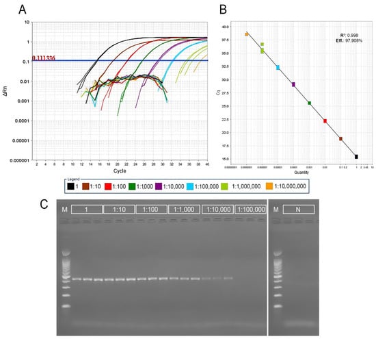 Sensitivity comparison between real-time PCR and conventional PCR assays for the detection of GBV-1 on grapevine accession PMC-313 using three replicates of a 10-fold dilution series. Isolation of DNA was performed using the DNeasy Plant Mini Kit (Qiagen, Hilden, Germany). 1—undiluted extract; 1:10–1:10,000,000—serial 10-fold dilutions. (A) Plots of DNA dilution series against threshold cycles values showing the dynamic range of the real-time PCR assay detection. The broken lines below the threshold represents negative controls for each dilution. (B) Standard curve analysis of the real-time PCR sensitivity: x-axis—DNA dilution; y-axis—measured quantification cycle (Cq) value; R2—determination coefficient; Eff.- real-time PCR efficiency. (C) PCR products obtained by conventional PCR on a 1.5% TBE agarose gel; M-marker (GelPilot 100 bp Plus Ladder, Qiagen, Hilden, Germany), N—negative controls for undiluted extract.