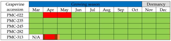 Detection of GBV-1 in five grapevine accessions by real-time PCR during the 2020 growing season and dormancy. Positive results are shown in green, while negative results are shown in red; N/A—not available.