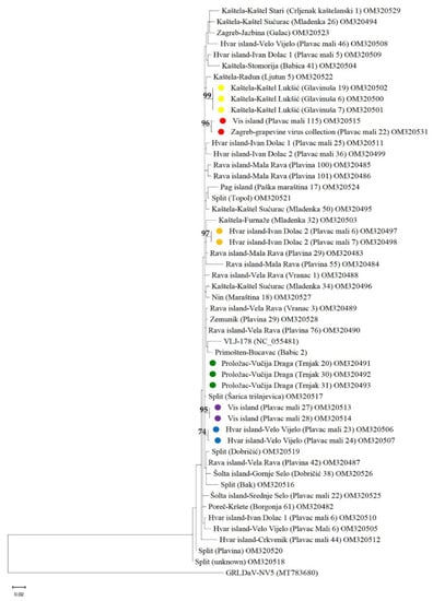 After the field survey, 50 GBV-1-positive vines originating from 23 different locations/vineyards were selected. From ten locations (Mala Rava, Vela Rava, Imotski, Kaštel Sućurac, Ivan Dolac 1, Ivan Dolac 2, Kaštel Lukšić, Velo Vijelo, island of Vis, and Split-collection plantation) three or four GBV-1-infected vines were selected, from the collection Split six, while from other GBV-1-positive locations one vine per site was selected. For the sequencing, the conventional PCR was performed in a reaction volume of 25 µL using the master mix and conditions as previously described. Sanger sequencing of the 419 bps long PCR products, comprising part of the RT region, was performed in both directions at Macrogen Europe (Amsterdam, The Netherlands). After primers removal, the 375 nts long sequences were reviewed and processed in Bioedit 7.2. []. The consensus sequences obtained for each isolate were compared phylogenetically with each other and with the GBV-1 reference isolate VLJ-178. The best model of nucleotide substitution and the construction of a phylogenetic tree using the maximum-likelihood (ML) method with 1000 bootstrap replicates was conducted using the MEGA11 software [] and GRLDaV isolate NV5 (MT783680) was used for rooting.