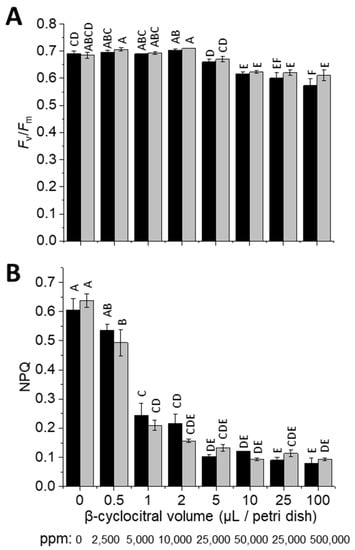 Effect of exogenous β-cyclocitral on Fv/Fm and NPQ in Chlamydomonas reinhardtii. (A) Measurements of Fv/Fm and (B) NPQ in 4 h HL-acclimated cultures were made after 4 h of treatment under very LL (see methods), of cell-wall-containing wild type (WT-4A; black bars) and cell-wall-less (cw15; grey bars) cultures, n = 3 ± SD, with distinct letters indicating significant differences (p < 0.05).