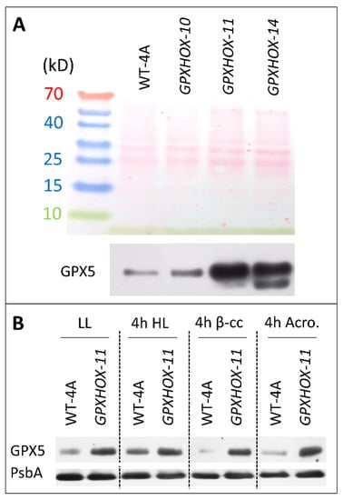 Protein levels of GPX5 in WT-4A and GPX5-overexpressor (GPXHOX) mutants under LL and in response to HL, β-cyclocitral and acrolein. (A) Three GPXHOX lines and WT-4A were analysed for GPX5 protein levels under LL. Shown above is the Ponceau-stained membrane for loading control. (B) The effect of LL, 4 h with HL, and 4 h with 600 ppm of β-cyclocitral (β-cc) or with 600 ppm of acrolein (4 h Acro.) under LL, on GPX5 levels. The D1 reaction centre of photosystem II (PsbA) was used for loading control.