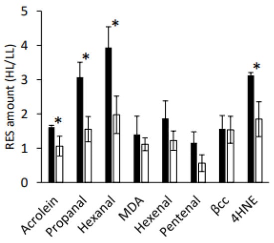 Influence of GPX5 overexpression on aldehyde/RES accumulation. Change in RES concentrations in response to HL (600 μmol photons m−2 s−1) for 4 h, relative to levels before treatment at LL (50 μmol photons m−2 s−1), in wild-type (black) and GPXHOX-11 (white). MDA: malondialdehyde, βcc: β-cyclocitral, 4HNE: 4-hydroxynonenal. n = 4 ± SD with * denoting significant differences between genotypes (p < 0.05).