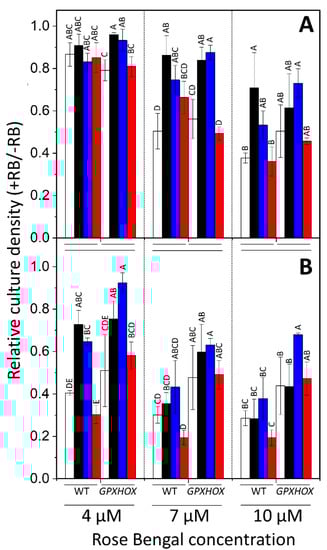 Influence of GPX5-overexpression and effect of HL, β-cyclocitral, and acrolein pre-treatments on tolerance to 1O2. Tolerance to 1O2 was tested by exposing WT 4A or GPXOX-11 cultures to (A) 250 μmol photons m−2 s−1 for 10 min or (B) 50 μmol photons m−2 s−1 for 24 h, in a medium that initially contained 4 μM, 7 μM, or 10 μM of rose bengal (RB). Before treatment with RB, cells were from LL (control; white) or pre-treated with 4 h of HL (black), 600 ppm of acrolein (blue) or 600 ppm of β-cyclocitral (red) under LL. To reveal tolerance to 1O2, cell density was monitored for 24 h after RB treatment by turbidity of culture at 650 nm and is shown relative to turbidity of the respective pre-treated cultures not treated with RB. Bars labelled with different letters within the same RB treatment denote significant differences from each other (Tukey’s post hoc after arcsine transformation, p < 0.05, n = 3 ± SD).