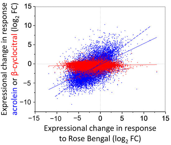 Correlation of differential gene expression induced by treatment with 1O2 and acrolein (blue) or 1O2 and β-cyclocitral (red). Levels of mRNA are expressed as log2 fold changes (log2FC), relative to mock-treated cells, calculated from RNA-Seq analyses; n = 3 for treatments and controls. Treatments with acrolein and β-cyclocitral were at 600 ppm and 1O2 was induced by rose bengal (RB; 1 μM under growth light at 50 μmol quanta m−2 s−1). Continuous and dashed lines of best fit consider all and only significantly affected genes, respectively. See Table S1 for expression levels of each gene. RNA-Seq data for acrolein and RB treatments adapted with permission from [13] 2018, Copyright Elsevier.