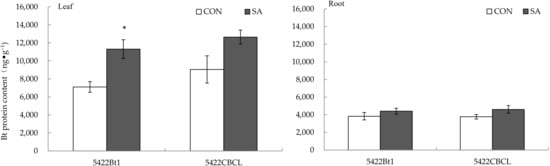 The aboveground part treated with SA did not systematically effect the Bt protein content in the roots of the two Bt corns (5422Bt1 and 5422CBCL) (Figure 1).