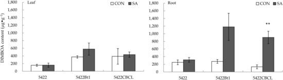 There was no difference in the DIMBOA content in the leaves of the conventional corn and the Bt corns (5422Bt1 and 5422CBCL) after the application of SA to the aboveground part (Figure 2).