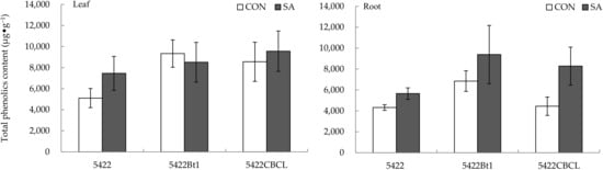 The SA treatment of the aboveground part had no significant systematic effect on the content of the total phenols in the roots of the two Bt corns (5422Bt1 and 5422CBCL) and the conventional corn 5422 (Figure 3).