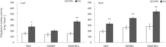 Direct and systemic effects of exogenous salicylic acid application to the aboveground part on the activity of polyphenol oxidase in the leaves and roots of conventional and Bt corns. The data in the figure are means ± standard errors. Significance among the data was determined by paired Student’s t-test. “*” showed p < 0.05, “**” showed p < 0.01. CON: control; SA: salicylic acid.