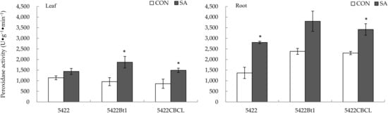 Direct and systemic effects of exogenous salicylic acid application to the aboveground part on the activity of peroxidase in the leaves and roots of conventional and Bt corns. The data in the figure are means ± standard errors. Significance among the data was determined by paired Student’s t-test. “*” showed p < 0.05. CON: control; SA: salicylic acid.