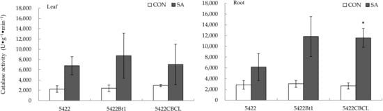 Direct and systemic effects of exogenous salicylic acid application to the aboveground part on the activity of catalase in the leaves and roots of conventional and Bt corns. The data in the figure are means ± standard errors. Significance among the data was determined by paired Student’s t-test. “*” showed p < 0.05. CON: control; SA: salicylic acid.