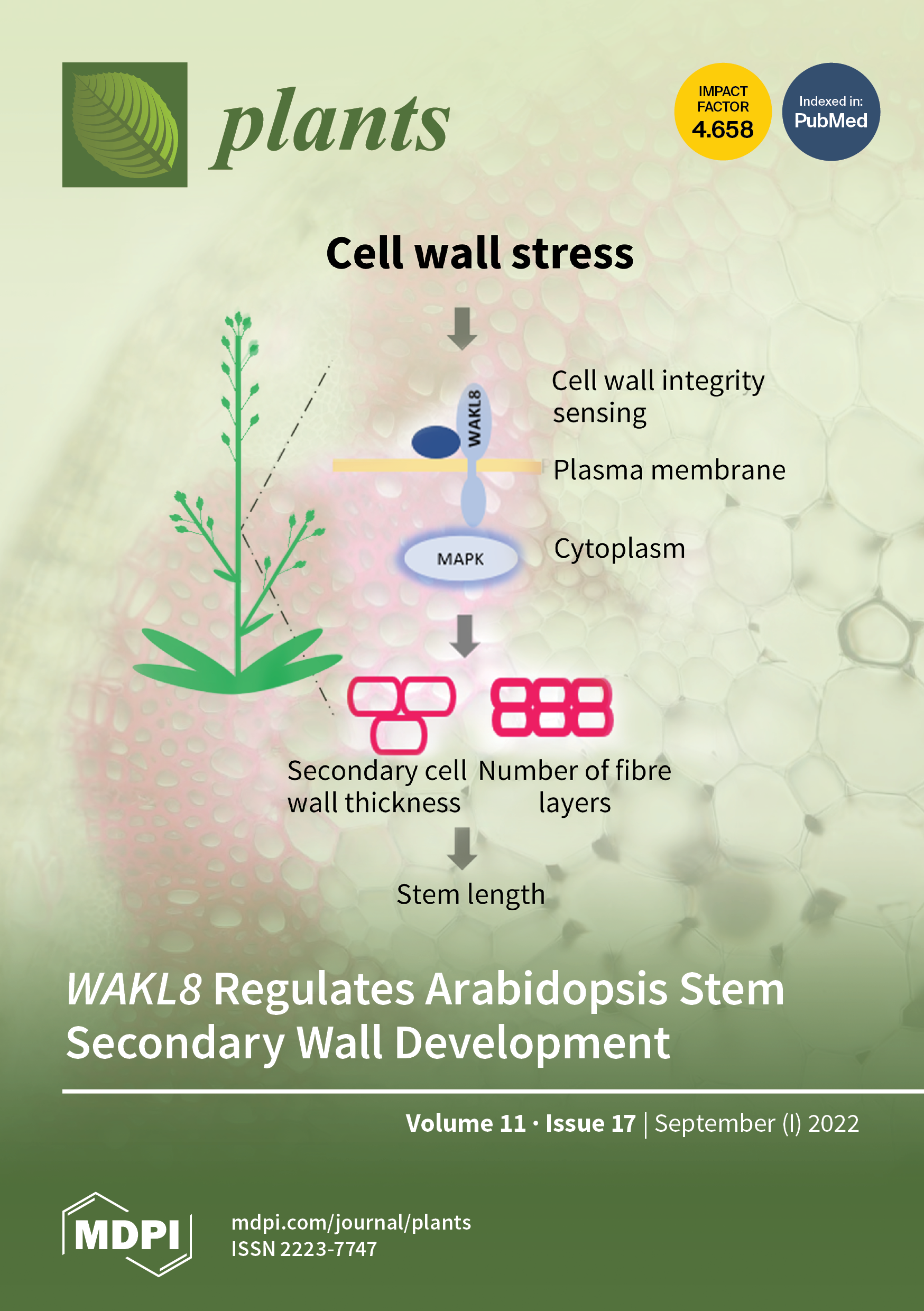 Cover Story: Wall-associated kinases/kinase-likes (WAKs/WAKLs) are plant cell surface sensors. The role of WAKs/WAKLs during the development of the secondary cell walls (SCWs) remains unclear. In this study, we used RNA-seq data to screen Arabidopsis thaliana WAKs/WAKLs members that may be involved in SCW development and identified WAKL8 as a candidate. Decreased WAKL8 transcript levels in stems were found in wakl8-2 T-DNA insertion mutant plants, and the phenotypes observed included reduced stem length and thinner walls in cells with secondary walls, including xylem vessels and interfascicular fibers, compared with WT plants. We also found that WAKL8 had alternative spliced versions predicted to have only extracellular regions, which may interfere with the function of the full-length version of WAKL8. View this paper - Issues are regarded as officially published after their release is announced to the table of contents alert mailing list .