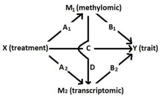 An elaborated association study was performed using the framework of a mediation study [30] on the omics data. The primary objective of the analysis was to evaluate whether the treatment, methylomic, and transcriptomic data had a (direct or indirect) effect on the traits.