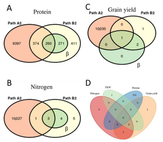 Overlapping significant sites for the different steps in the mediation analysis. Nitrogen is nitrogen uptake. (A) Of the 1316 significant sites from path B2 on protein, 634 sites overlap with part A2, and 531 of the regression coefficients (β) are lower in absolute value than the beta from path C. Of these 531, 260 are shared with path A2 and B2. (B) Of the 13 significant sites from path B2 on nitrogen uptake, 4 of the sites overlap with part A2, and 7 of the β are lower in absolute value than the β from path C. Of these 7, 3 are shared with path A2 and B2. (C) Of the 4 significant sites from path B2 on grain yield, 1 of the sites overlaps with part A2, and 3 of the β are lower in absolute value than the β-values from path C. Of these 3, 1 is shared with path A2 and 2 with B2. (D) The relationship between the β values from each trait. Only 2 sites overlap, and it is between grain yield traits and nitrogen uptake. The plots are made using the R package “VennDiagram” [31].