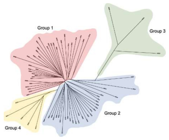 Lines were assigned to four groups based on the dendrogram (Figure 4) calculated from the 1,316,898 SNPs detected in the transcriptome.